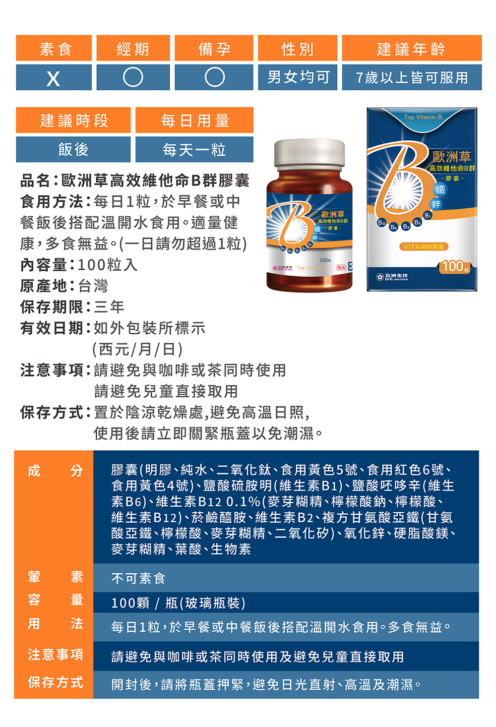 內容物:膠囊(明膠、純水、二氧化鈦、食用黃色5號、食用紅色6號、食用黃色4號)、鹽酸硫胺明(維生素B1)、鹽酸呸哆辛(維生素B6)、維生素B12 0.1%(麥芽糊精、檸檬酸鈉、檸檬酸、維生素B12)、菸鹼醯胺、維生素B2、複方甘氨酸亞鐵(甘氨酸亞鐵、檸檬酸、麥芽糊精、二氧化矽)、氧化鋅、硬脂酸鎂、麥芽糊精、葉酸、生物素。