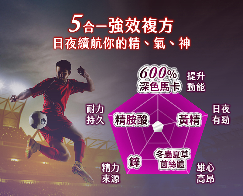 .帝王級5合一威猛配方(馬卡、精氨酸、鋅、黃精、冬蟲夏草菌絲體)